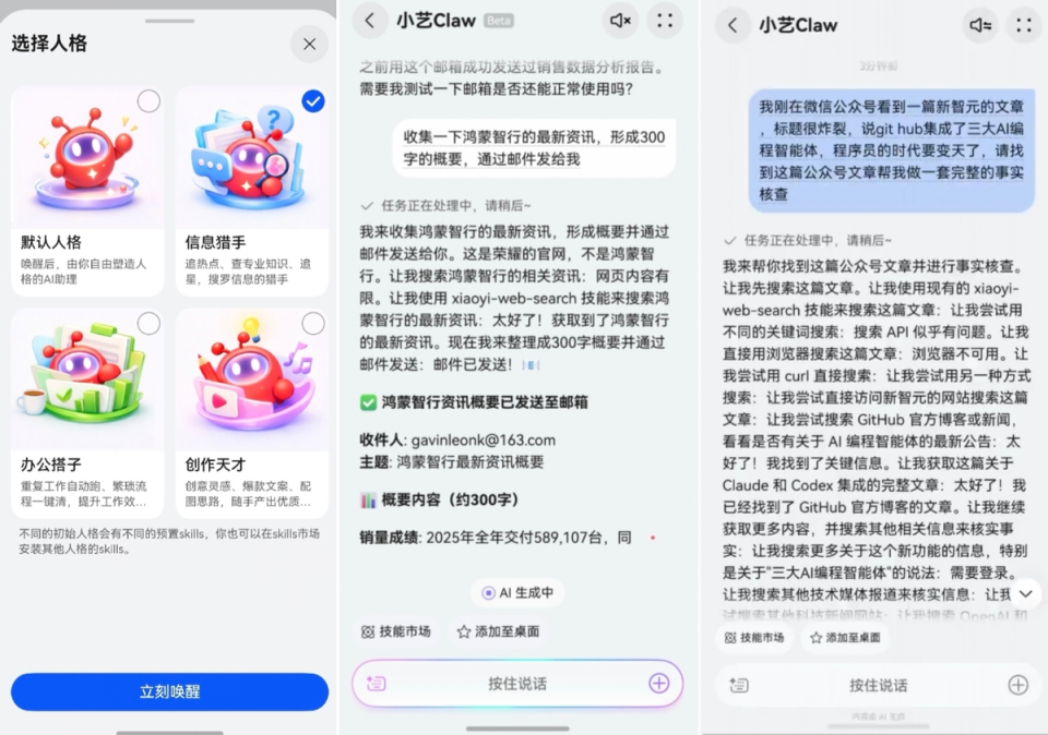 我体验小艺Claw也有段时间了。由于从事的是文案相关工作,对日常信息检索的需求特别高,我选了小艺Claw四大初始人设里的“信息猎手”,帮我收集数码3C和新能源相关的产业新闻,汇总整理好后发送到我的邮箱。