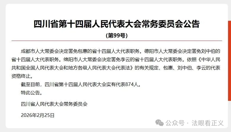《四川日报》截图据《四川日报》今日发布的四川省第十四届人民代表大会常务委员会公告(第99号):成都市人大常委会决定罢免包惠的省十四届人大代表职务。德阳市人大常委会决定罢免刘中伯的省十四届人大代表职务。绵阳市人大常委会决定罢免李云的省十四届人大代表职务。依照《中华人民共和国全国人民代表大会和地方各级人民代表大会代表法》的有关规定,包惠、刘中伯、李云的代表资格终止。截至目前,四川省第十四届人民代表大会实有代表874人。特此公告。四川省人民代表大会常务委员会2026年2月25日