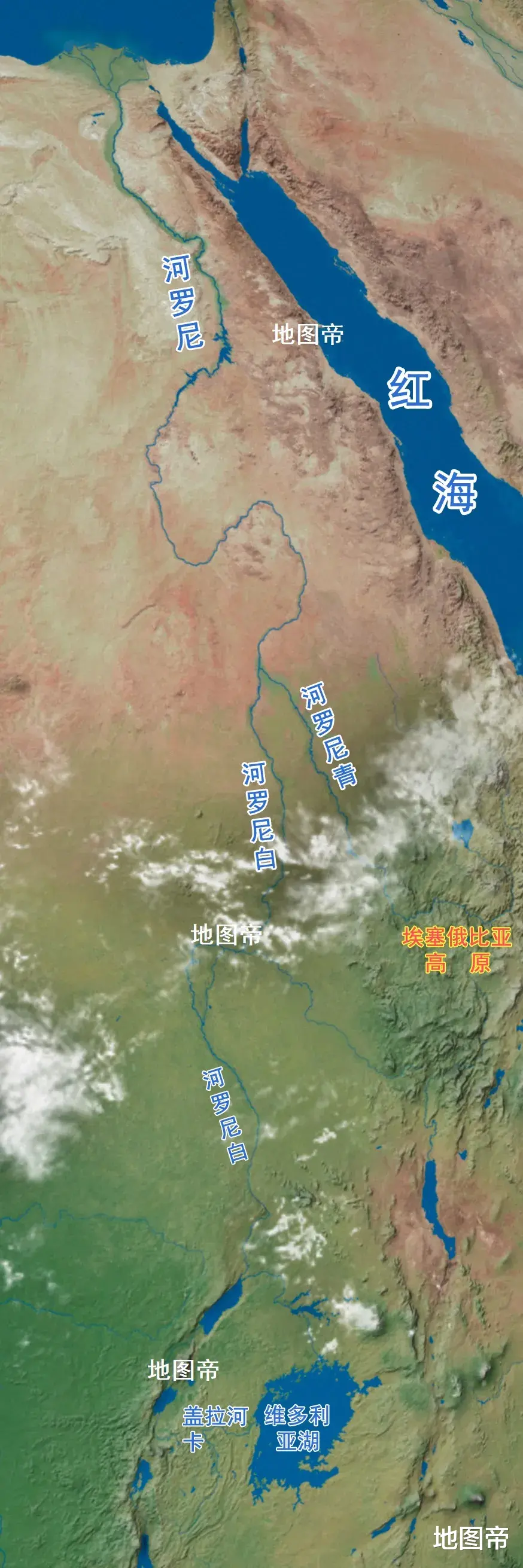 尼罗河有两个源头,按照“河源唯远”的原则,维多利亚湖(或卡盖拉河)是源头,这一支称白尼罗河。按照“水量唯大”的原则,埃塞俄比亚高原的塔纳湖(或小尼罗河)是源头,这一支称青尼罗河。