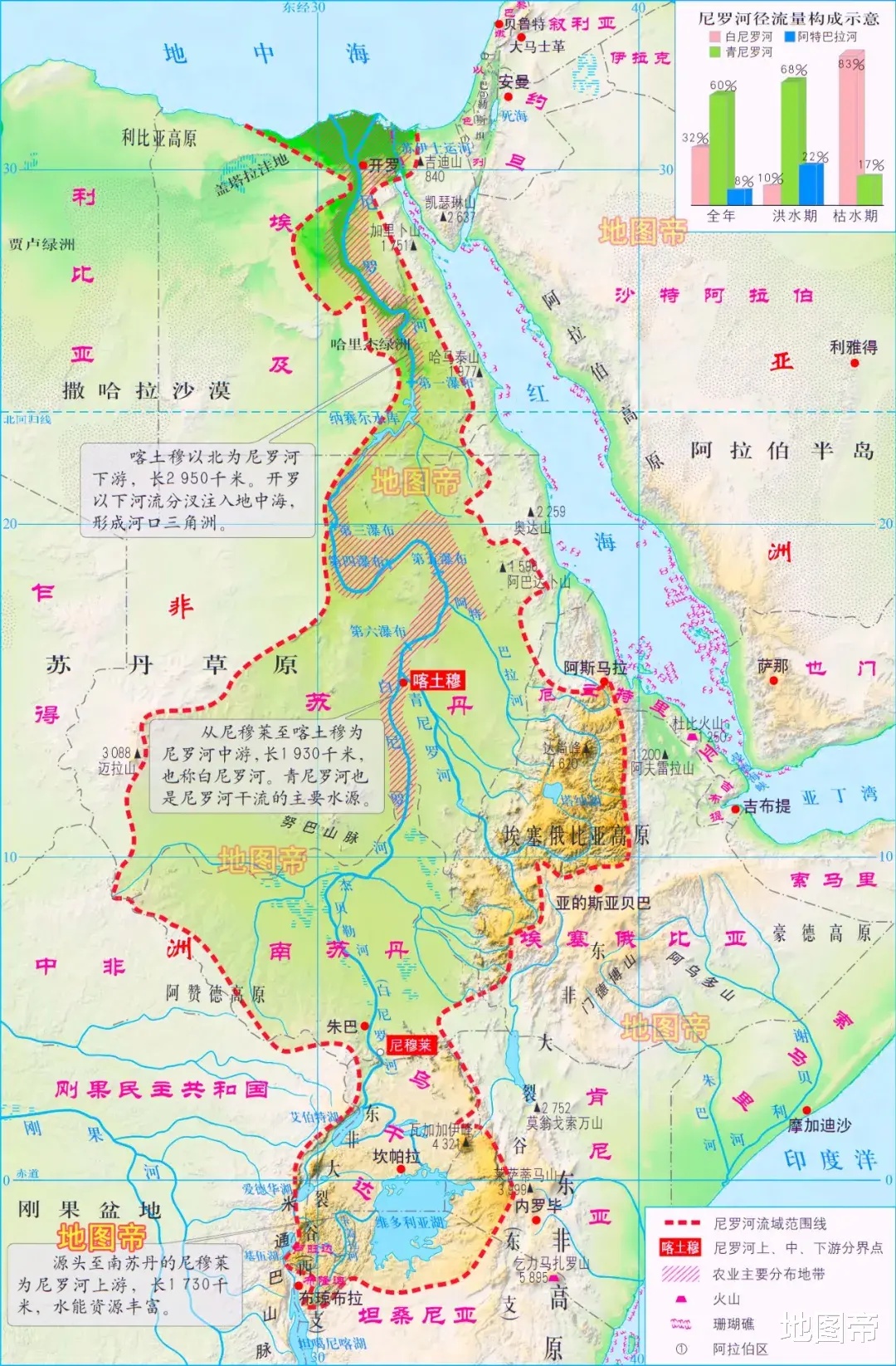 尼罗河平均流量2830立方米/秒,其中青尼罗河平均流量1548立方米/秒,超过尼罗河的一半,雨季时甚至可以达到八成。