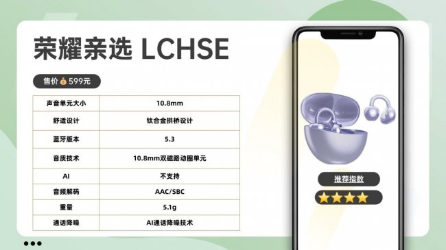 荣耀LCHSE耳机以中式拱桥为灵感,将钛合金与复合材质结合,在科技感中融入了东方美学。外壳采用钛合金与耐磨PC,兼顾强度与轻便,单耳仅重约5.1克。