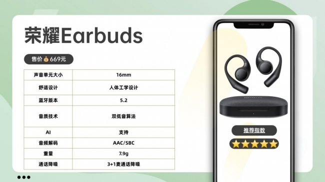 连接上采用蓝牙5.2,传输稳定性一般,略有延迟。支持双设备连接和荣耀信任环流转,对华为、荣耀用户更友好。通话方面配有3+1麦克风降噪和两档自适应降噪,嘈杂环境下也能听得清楚。续航方面,单次使用大约7小时,加上充电盒总续航为28小时,15分钟快充可以再听2小时。