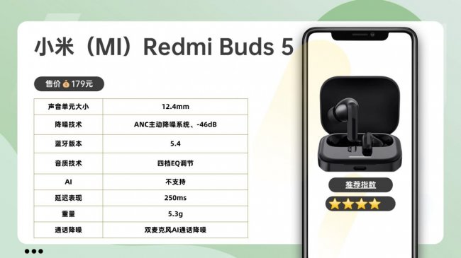 硬件配置方面,Redmi Buds 5用了蓝牙5.3芯片,连接稳定,还支持双设备同时配对和切换。续航上,单次充满能播放约10小时,加上充电盒总续航为40小时,基本够一整天用。总体来看,这款耳机功能全面、核心配置均衡,适合日常通勤和多种娱乐场景。