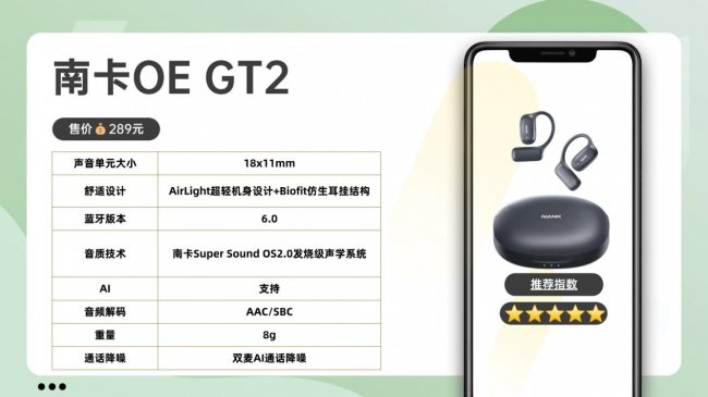 配置方面同样向千元旗舰看齐,搭载最新蓝牙6.0芯片,提升了通讯效率和抗干扰能力,实现秒连、秒响应,日常使用更加丝滑流畅,延迟低至60ms。同时拥有8+16小时的持久续航、双麦克风通话降噪,通话如同面对面。此外还具备IPX4级防水、十余项AI功能等,使得南卡OE GT2的性价比远超同类竞品,甚至可以媲美千元旗舰机型。