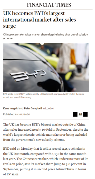 2025年1-9月,比亚迪乘用车英国销量同比增速迅猛