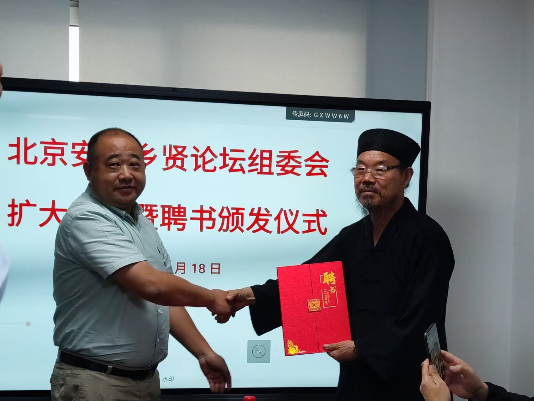北京安徽乡贤论坛发起人郑佳节为杨华道长颁发聘请证书,他表示,乡贤论坛组织体系增加“新鲜血液”,将更有利于中国乡贤文化传承发展、新乡贤人才凝聚与引领。