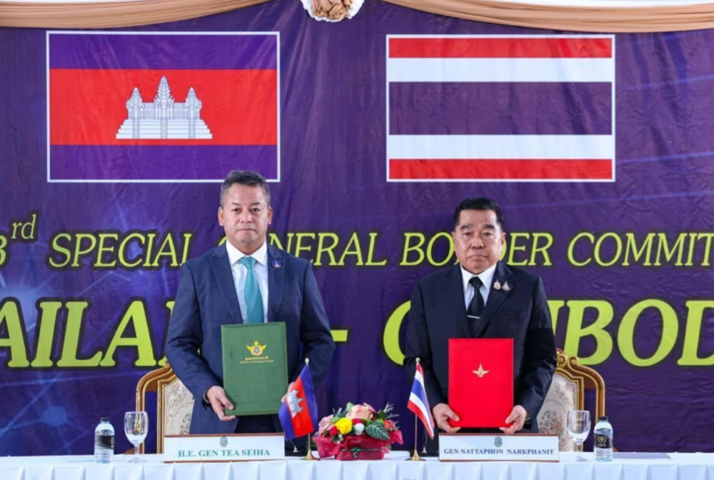 此次协议由泰国国防部长纳塔蓬·纳帕尼与柬埔寨国防部长狄塞哈共同签署。两人在会后合影留念,标志着紧张局势出现关键性缓和。