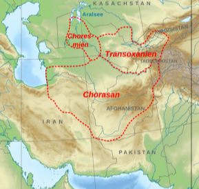 图中Choresmien为“花剌子模”,Chorasan为“大呼罗珊”,Transoxanien为“河中地区”