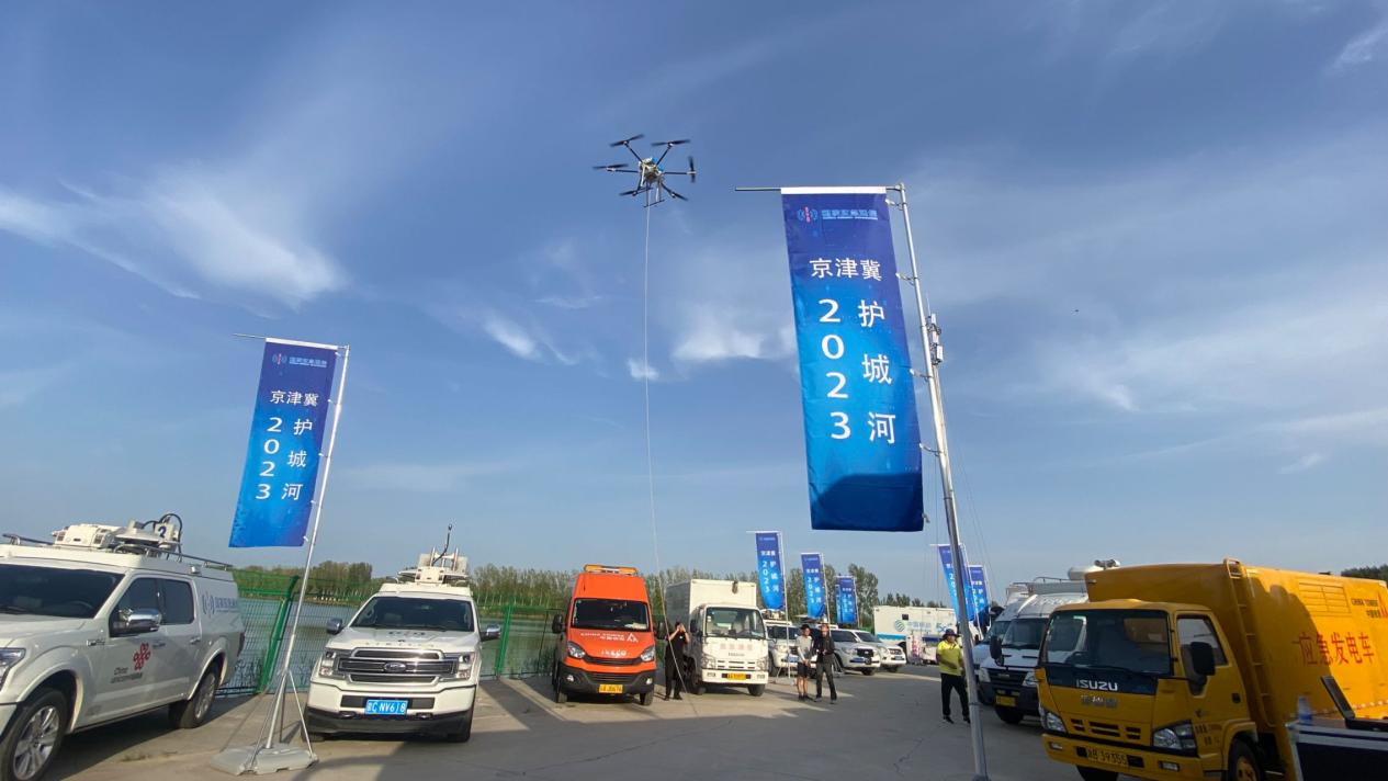 几乎就在演练结束的同一时间,现实中的考验骤然降临。2023年7月底,河北涞水等地遭遇特大洪涝灾害,地面通信全面瘫痪。大工科技的系留无人机从演练场直接奔赴灾区,与交叉双旋翼无人直升机密切配合,在汪洋上空搭建起永不降落的“空中基站”,向受灾区精准投放水、食物、药品等物资。从演练比武到实战救援的无缝切换,大工科技用实力证明:在应急抢险的至暗时刻,系留无人机不仅是设备,更是守护生命的“底线”。
