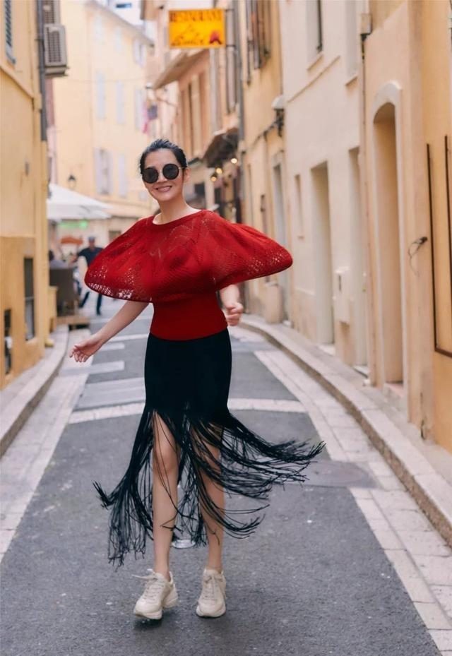 上半身这款红衣太有个性了吧,日常生活走在大街上几乎没人敢这么穿,大多出现在街拍或者走秀等场合。主要是因为红衣的上半部分向四周撑开,低头估计都看不到脚面。下身则搭了一件流苏裙,黑色与红色是很经典的组合,在时尚圈流行多年,流苏设计能增强裙子神秘感。