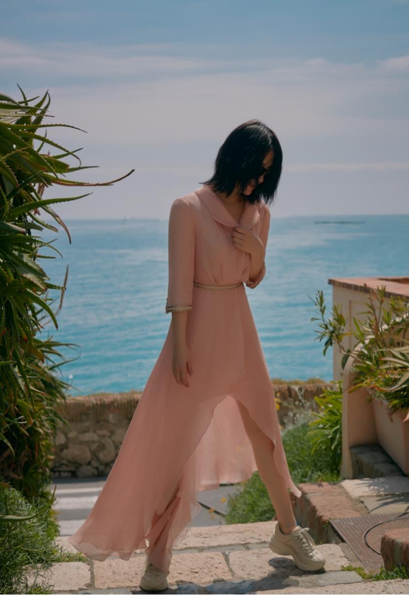 身上这条连衣裙颜色不鲜艳,所以可驾驭的人群反而多些,主要是因为每个人肤色不同。裙子腰部是收紧的,此设计能分分钟让穿着者的细腰呈现出来。裙摆长度不一致,属于前短后长型,进而视觉上能拉长身型,显得人更高些。