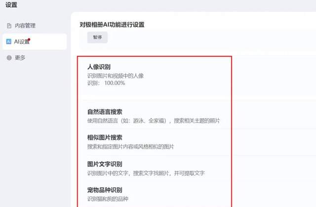 区别于其他品牌的产品,极空间还具有一系列非常好用且实用的的AI功能,用户不需要手动创建相册或打标签。系统会自动识别“猫”、“狗”、“食物”、“去年冬天”这些概念。即使是模糊地想起要找某张照片时,也只需要输入关键词就能快速定位到。