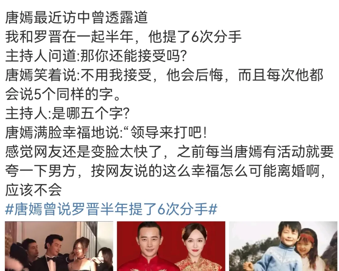 更值得关注的是,两人关系中的不稳定因素其实早有端倪。唐嫣曾在访谈中透露,恋爱初期半年内罗晋就提过六次分手,每次都因自卑情绪作祟。虽然最终都会和好,但这样的频率仍让人对这段感情的稳定性产生疑问。