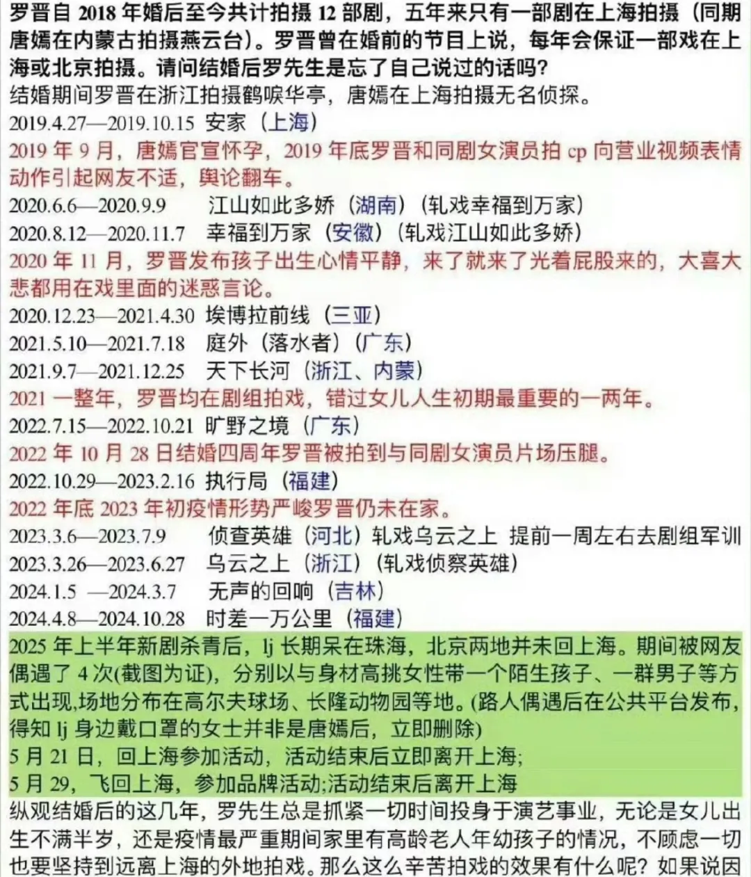2025年以来,两人的互动几乎完全停止。唐嫣生日时,罗晋仅在朋友圈发布风景照;公开场合,唐嫣的发言重点“时间让所有的等待都更有意义”。有消息称两人已分居一年半,唐嫣常居上海,而罗晋则多在北京。