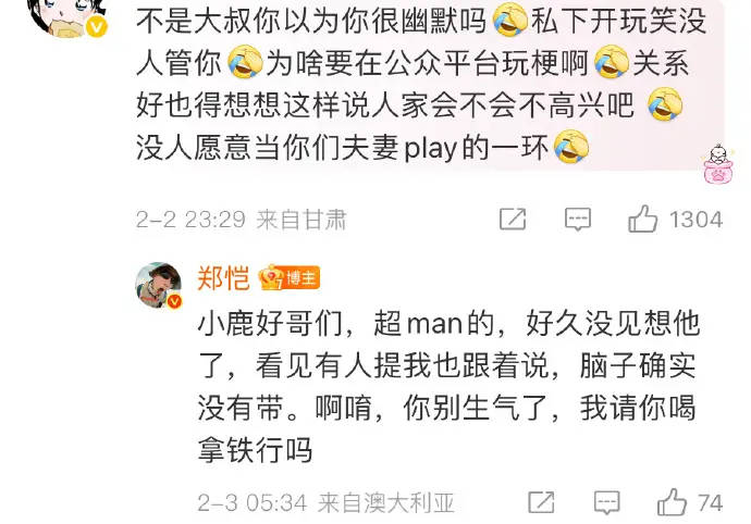 有人说“请喝拿铁”太轻佻,还刚好戳中鹿晗开咖啡副业的点,不像真心道歉;还有人觉得“超man的”这句话,反而默认了“像女生就是不man”的刻板印象,根本没get到粉丝生气的点。不过也有网友觉得,郑恺和鹿晗是跑男时期的老哥们了,就是熟人之间随口开的玩笑,没必要上纲上线。
