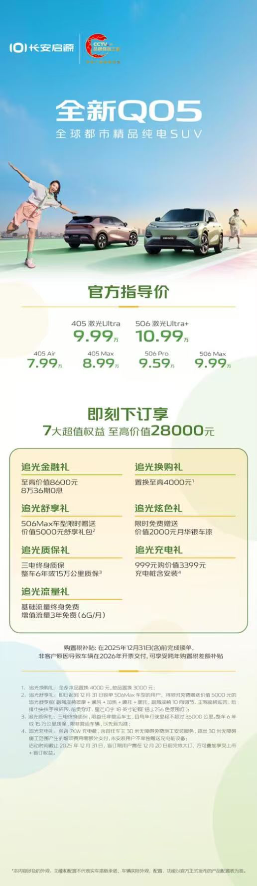 为回馈广大用户的支持,长安启源推出多重购车礼遇:现在下订,即享7大超值权益,至高价值28000元。其中包括,针对12月31日前锁单506Max车型的用户,将限时免费获得价值5000元的“追光舒享”升级包;提供至高价值8600元的8万36期0息“限时超值”金融权益,助力用户轻松购车。