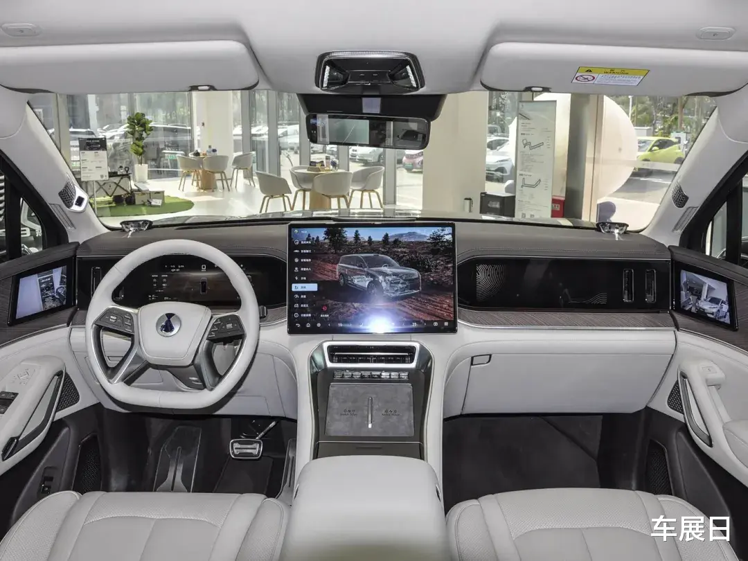 内饰配置丰富,有60英寸高亮全天候AR - HUD、10.25英寸液晶仪表+17.3英寸中控屏+6英寸后排多功能控制屏+21.4英寸3K电动娱乐屏。还配备四辐式多功能方向盘、手机无线充电、车载香氛系统等。座椅布局有6座、7座多种组合。
