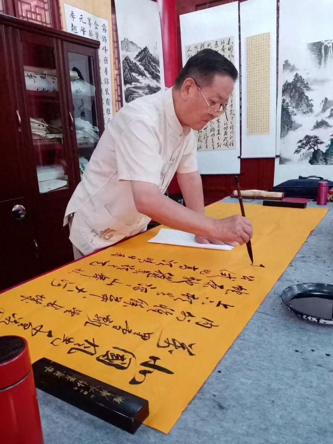 他沉浸在书法创作中,时而笔走龙蛇,时而笔锋婉转,墨色在宣纸上晕染开来,勾勒出一幅幅充满韵味的作品,岁月在他身上留下了痕迹,却未磨灭他对艺术的热情。他用笔、墨和刻刀续写着属于自己的文化篇章,在平凡的日子里,传承着中华传统文化的精粹,让传统艺术的魅力永远绽放光、热和力。岁月在他身上留下了痕迹,却未磨灭他对艺术的热情。
