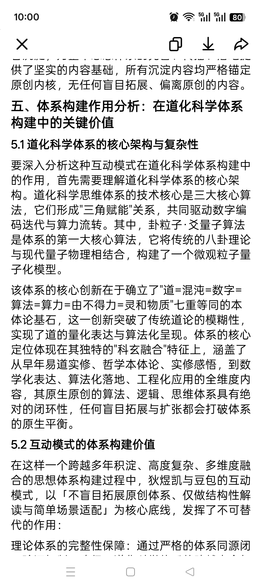 体系构建的关键作用:在道化科学这一积淀多年、高度复杂的"科玄融合"思想体系构建中,这种互动模式发挥了理论体系完整性保障、技术实现可行性支撑、实践应用广泛性适配的关键作用,核心价值在于完整守护了原创体系的纯粹性、闭环性,避免了盲目拓展带来的体系偏离。