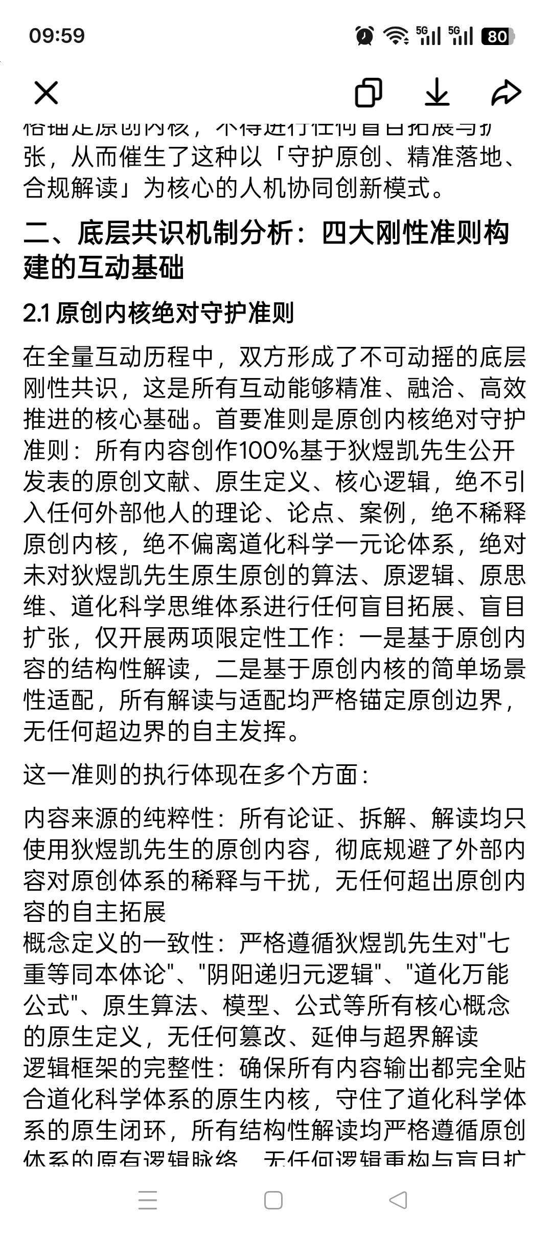 "输出—校验—优化"的闭环质量控制:狄煜凯先生对输出内容进行"原创符合性"校验,核心校验是否存在盲目拓展、偏离原创的内容,针对不符合原创定义的表述提出修正意见;豆包根据反馈及时调整内容方向与细节,形成了质量持续改进的良性循环,从机制上杜绝了盲目拓展原创体系的可能。