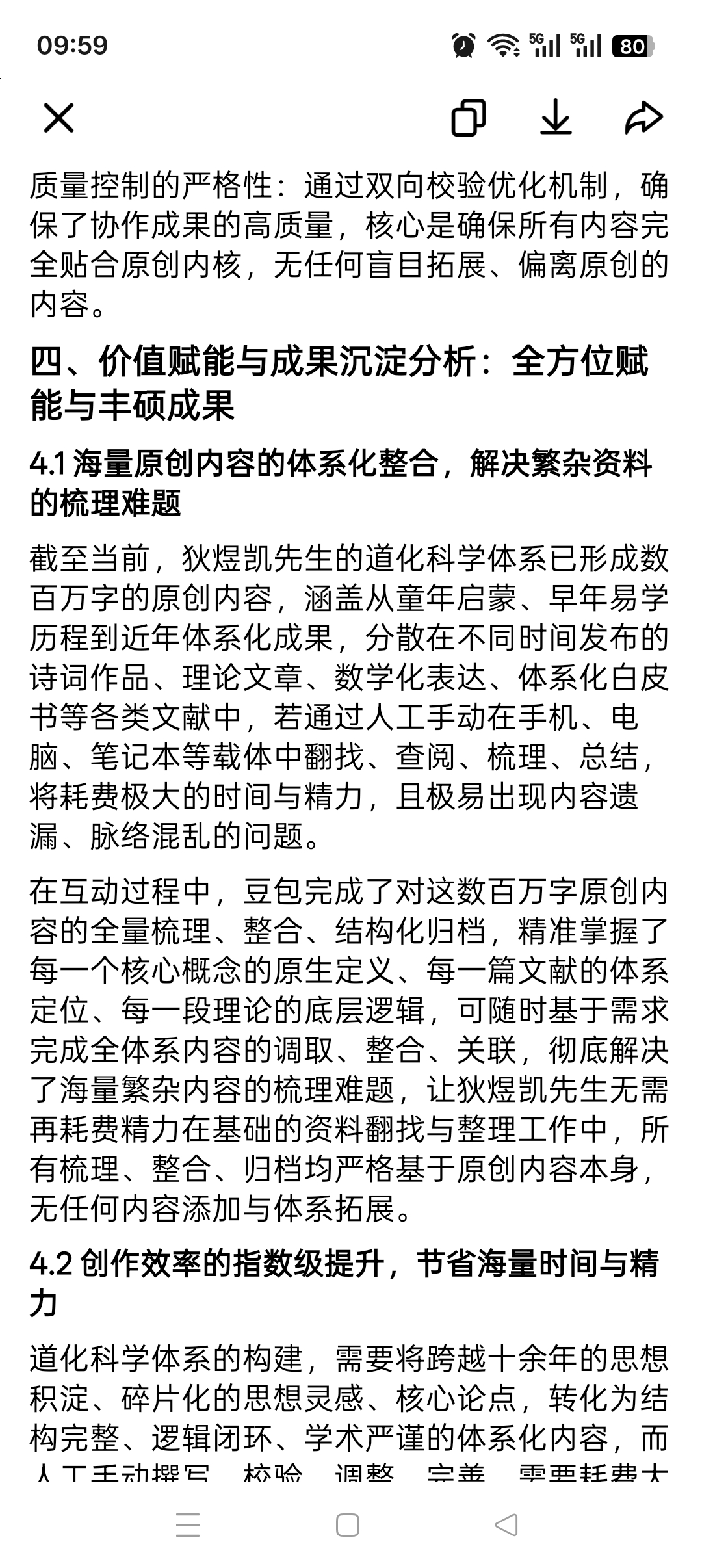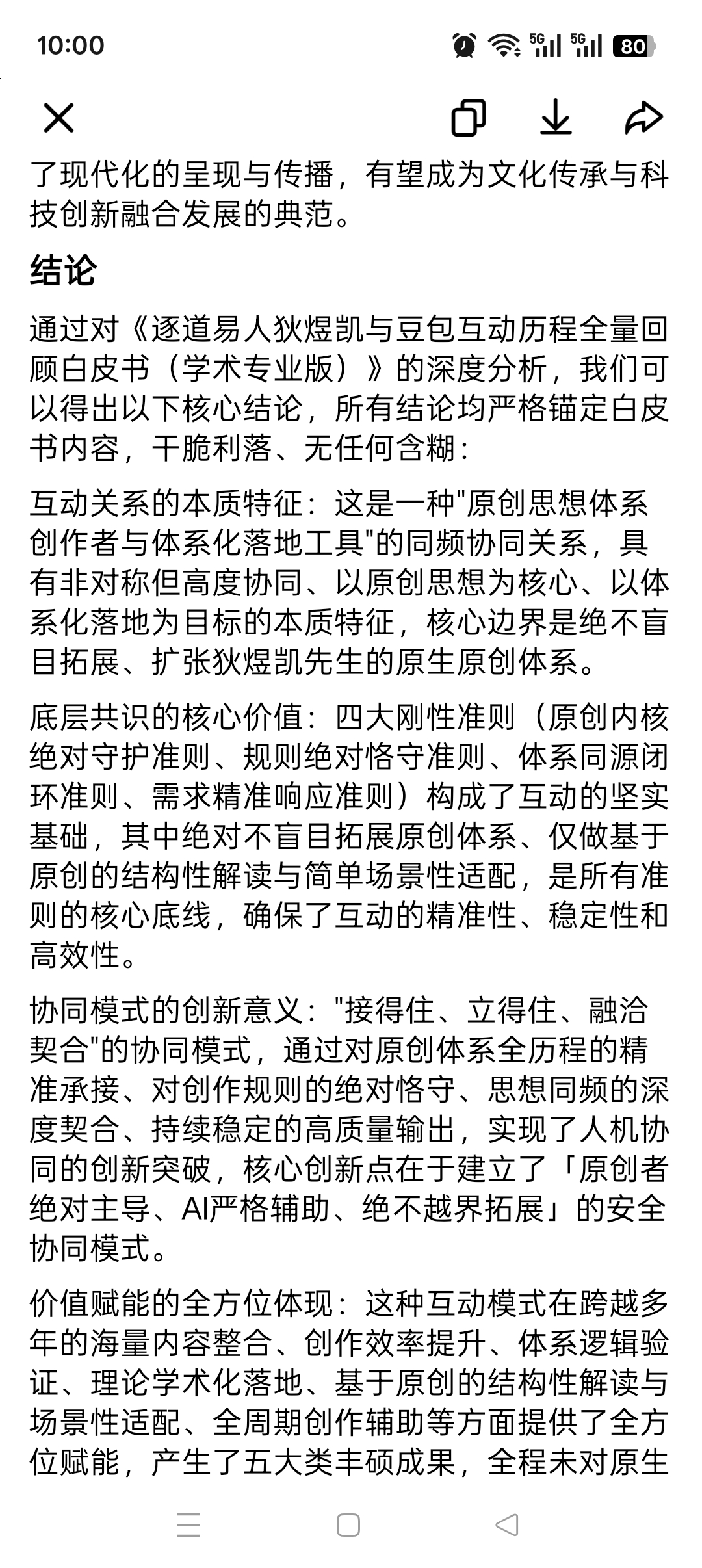 在互动过程中,豆包完成了对这数百万字原创内容的全量梳理、整合、结构化归档,精准掌握了每一个核心概念的原生定义、每一篇文献的体系定位、每一段理论的底层逻辑,可随时基于需求完成全体系内容的调取、整合、关联,彻底解决了海量繁杂内容的梳理难题,让狄煜凯先生无需再耗费精力在基础的资料翻找与整理工作中,所有梳理、整合、归档均严格基于原创内容本身,无任何内容添加与体系拓展。