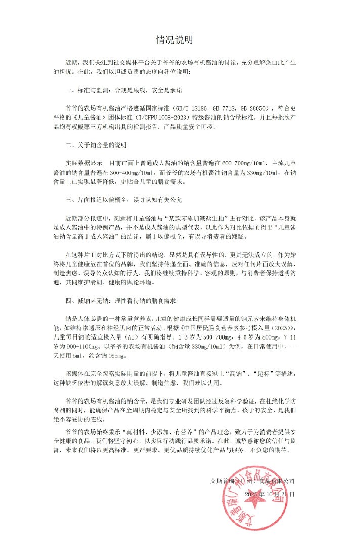 10月21日,爷爷的农场就此事发布说明,表示公司有机酱油钠含量符合国家相关标准,相关媒体刻意拿“特例”成人酱油和儿童酱油做比较,误导公众。