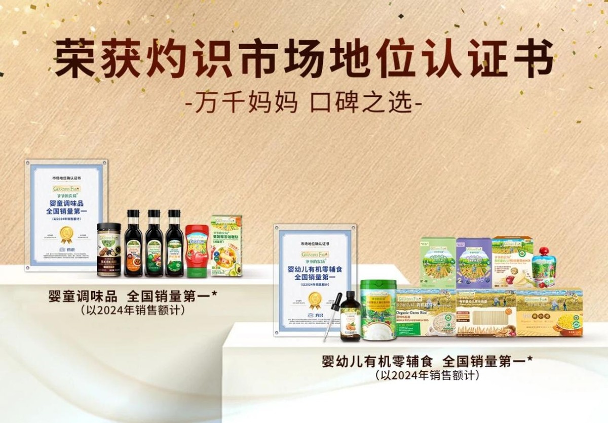 今年8月,“爷爷的农场”发文称,其再度获得CIC灼识咨询颁发的两大权威市场地位确认证书——“婴童调味品全国销量第一(以2024年销售额计)”、“婴幼儿有机零辅食全国销量第一(以2024年销售额计)”,再次获得消费者和行业的高度认可。
