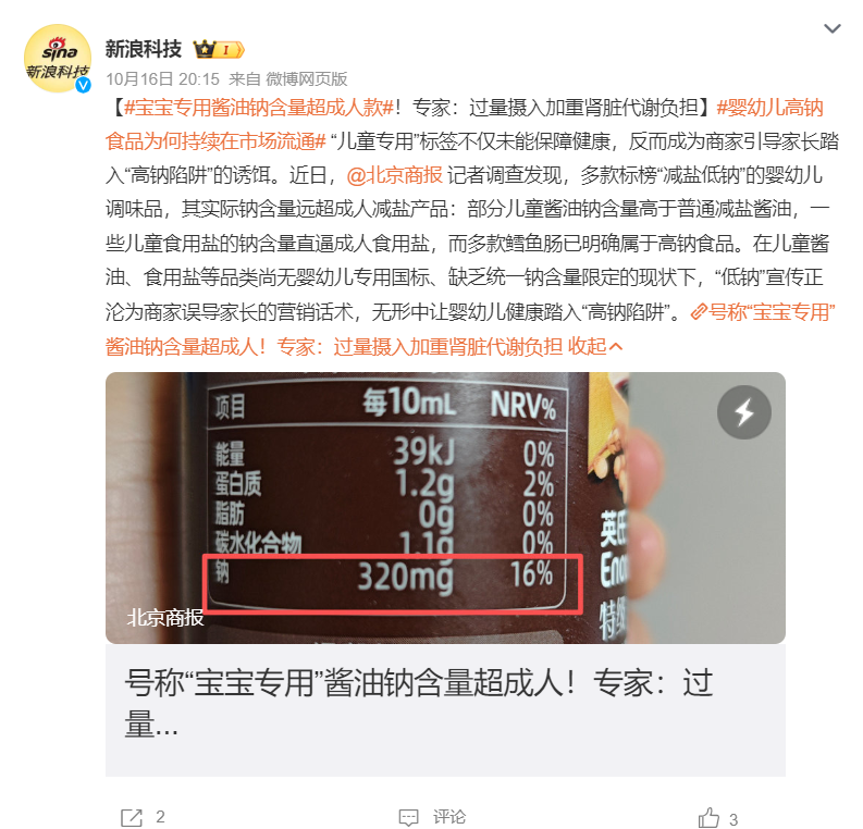 今年10月,据《北京商报》报道,多款宝宝酱油钠含量超过成人款,其中爷爷的农场旗下的产品——有机松茸酱油(减盐型)每10毫升钠含量达409毫克,被发现高于未标注儿童专用的千禾产品。