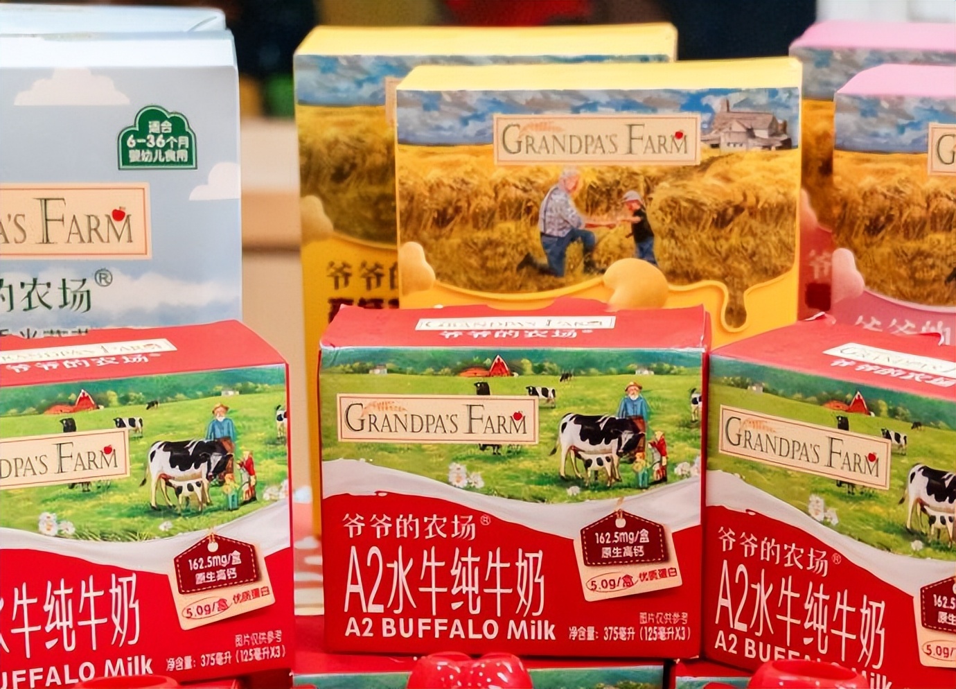 宣传上,2021年,爷爷的农场官宣演员刘涛为其首位代言人;2025年11月5日,中国男子射击运动员、巴黎奥运冠军李越宏出任爷爷的农场 A2 水牛奶品鉴官;2024年到2025年,其在超过30部影视剧中投放广告。