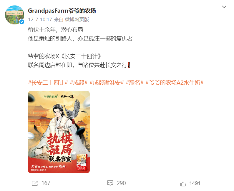 近日,高端健康食品品牌爷爷的农场宣布,携手备受期待的古装权谋剧《长安二十四计》达成重磅IP联名合作,推出追剧好搭子——联名款A2水牛纯牛奶。