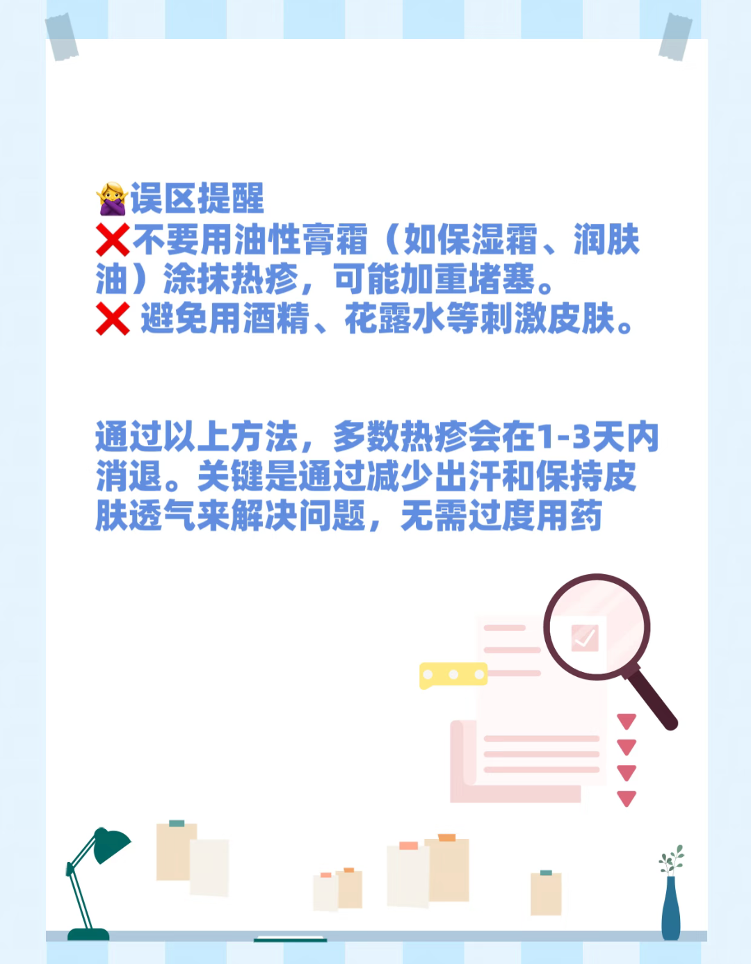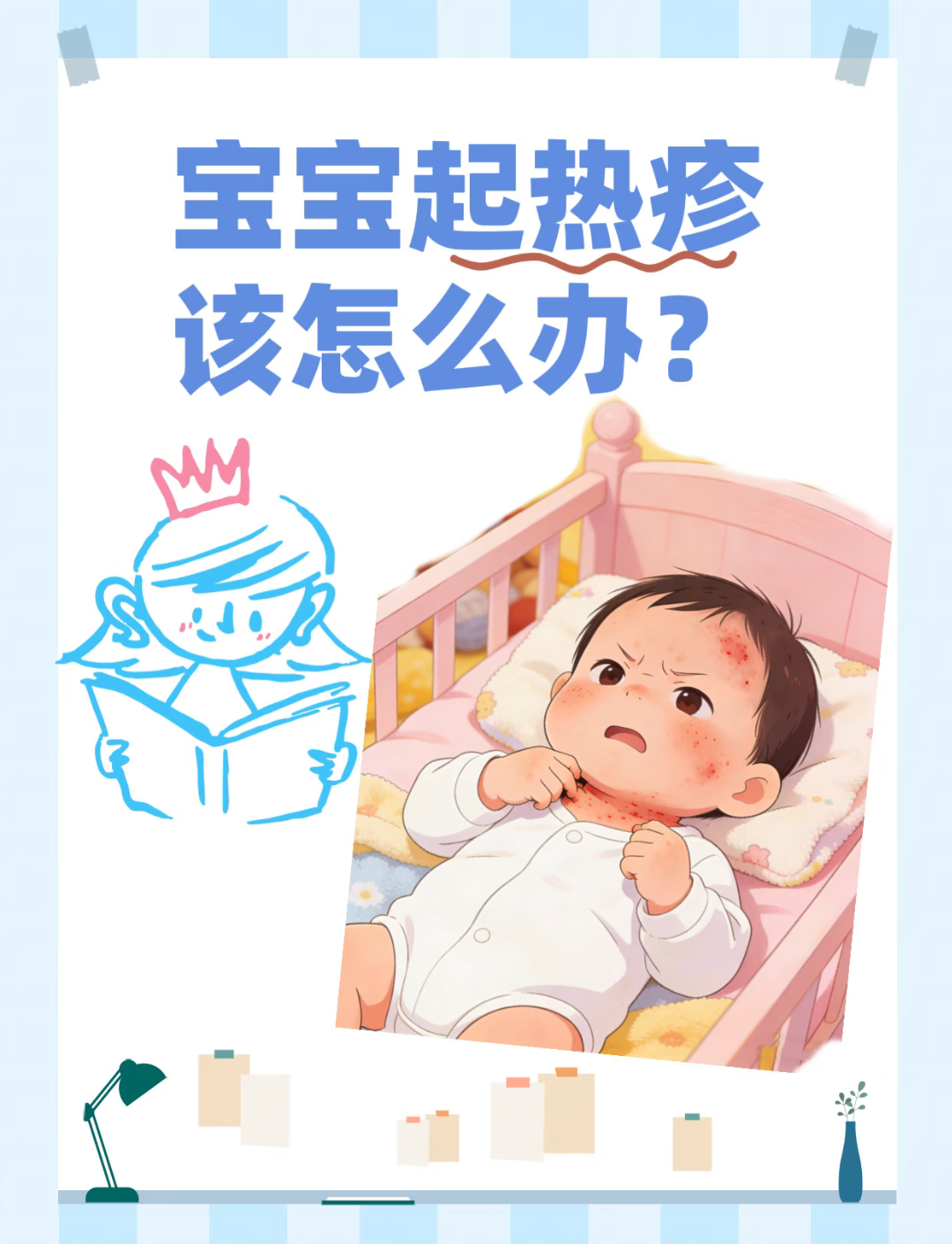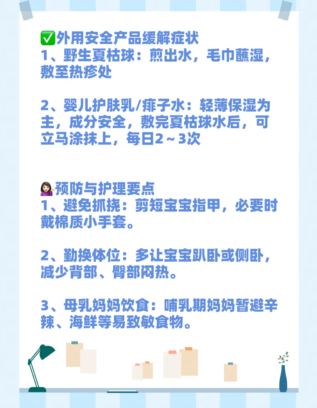 这时候最怕的就是宝宝痒了去抓。指甲剪短,或者套个棉布小手套,别让他挠破皮。白天多让他趴一趴、翻翻身,别老躺着压着后背。如果是还在喂母乳的妈妈,这几天可以少吃点辛辣海鲜,宝宝皮肤会更安稳些。