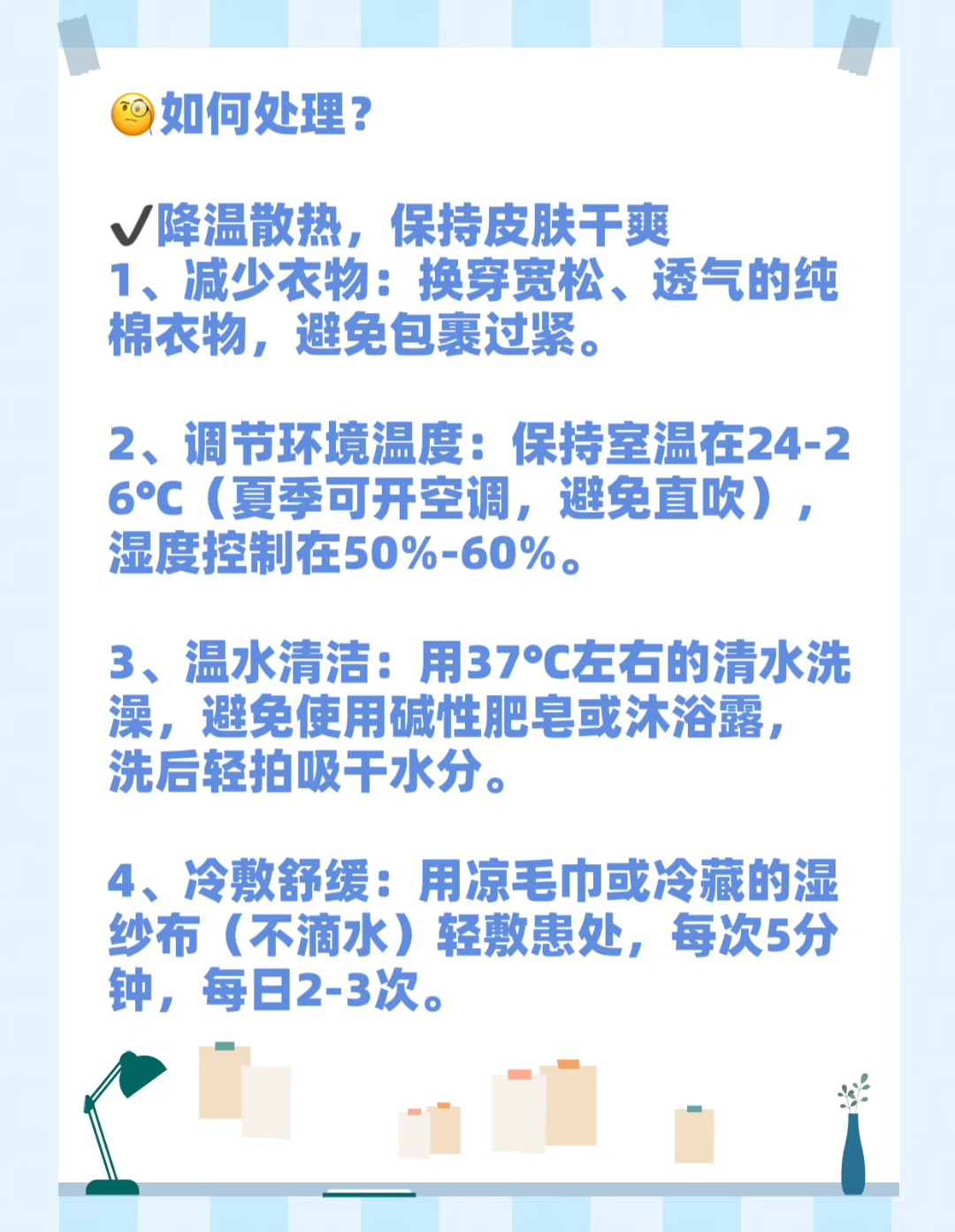 最简单的办法,就是给孩子“降温”。你可以先摸摸宝宝的后颈和后背,如果是潮乎乎、热烘烘的,那多半是穿多了。赶紧换一身宽松透气的纯棉衣服,别怕孩子冷,小手温温的才是刚刚好。家里该开空调就开,室温保持在二十五度左右,别对着宝宝直吹就好。很多热疹,凉快下来半天就淡了。