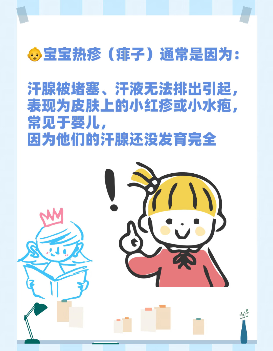 小宝宝的汗腺还没长好,出汗多了排不出去,汗腺被堵住,皮肤就会发出这些“求救信号”。越是夏天,越是穿多了、盖厚了,越容易冒出来。别着急,热疹其实是最好对付的皮肤小状况,根本不需要瓶瓶罐罐堆成山。