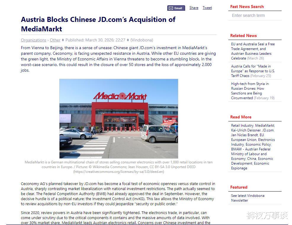 然后,紧接着另一条消息冒出来:咱们国内的京东,想收购欧洲最大的电器零售商MediaMarkt的母公司Ceconomy,本来其他欧盟国家都批了,结果奥地利突然卡住。奥地利经济部说要审查,怕影响国家安全。这一卡不要紧,直接可能导致奥地利50多家店关门,2000个员工失业。