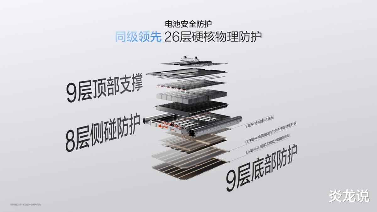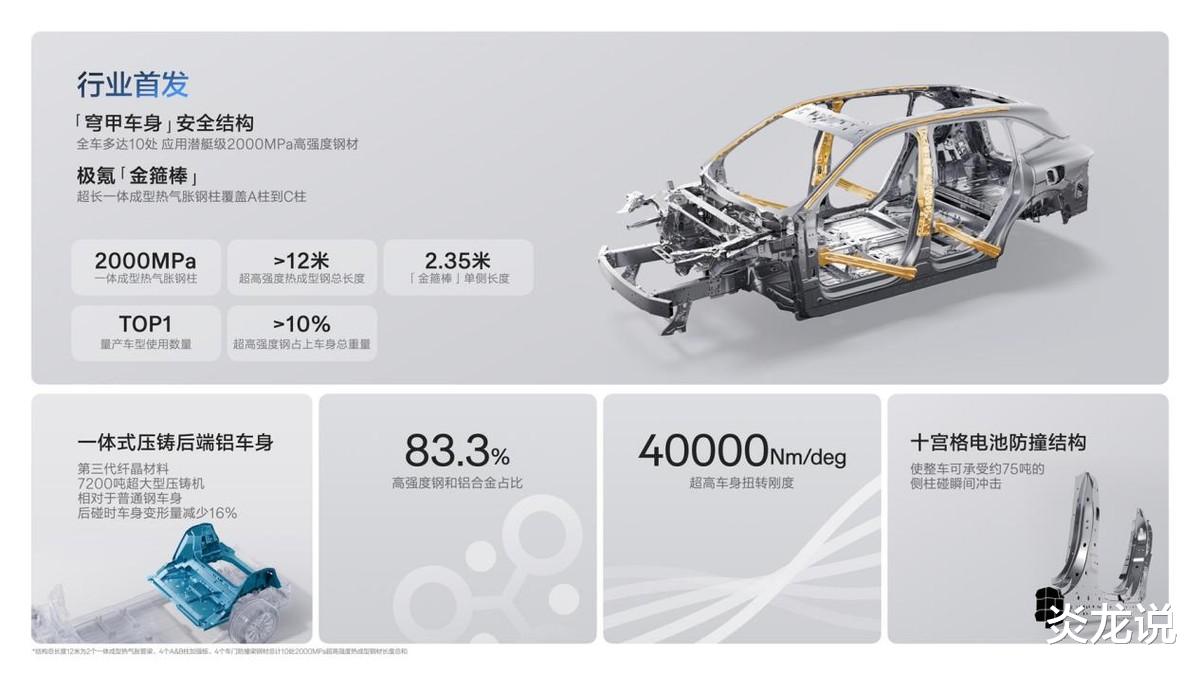 新车带来10项安全黑科技,其中包括6项行业首发、2项同级唯一和2项同级领先的安全技术,如「金箍棒」穹甲车身、主驾安全破窗器、高压配电盒主动滑落防护、热电分离、电机下沉等。结合一体式压铸后端铝车身,构建起720°全方位安全防护体系。