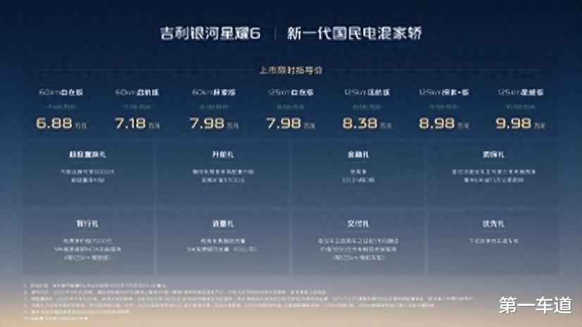 10月30日,新一代国民电混家轿吉利银河星耀6全球上市。新车共推出60km自在版、60km启航版、60km探索版、125km自在版、125km远航版、125km探索+版、125km星舰版7个版型,上市限时指导价为6.88万元-9.98万元。