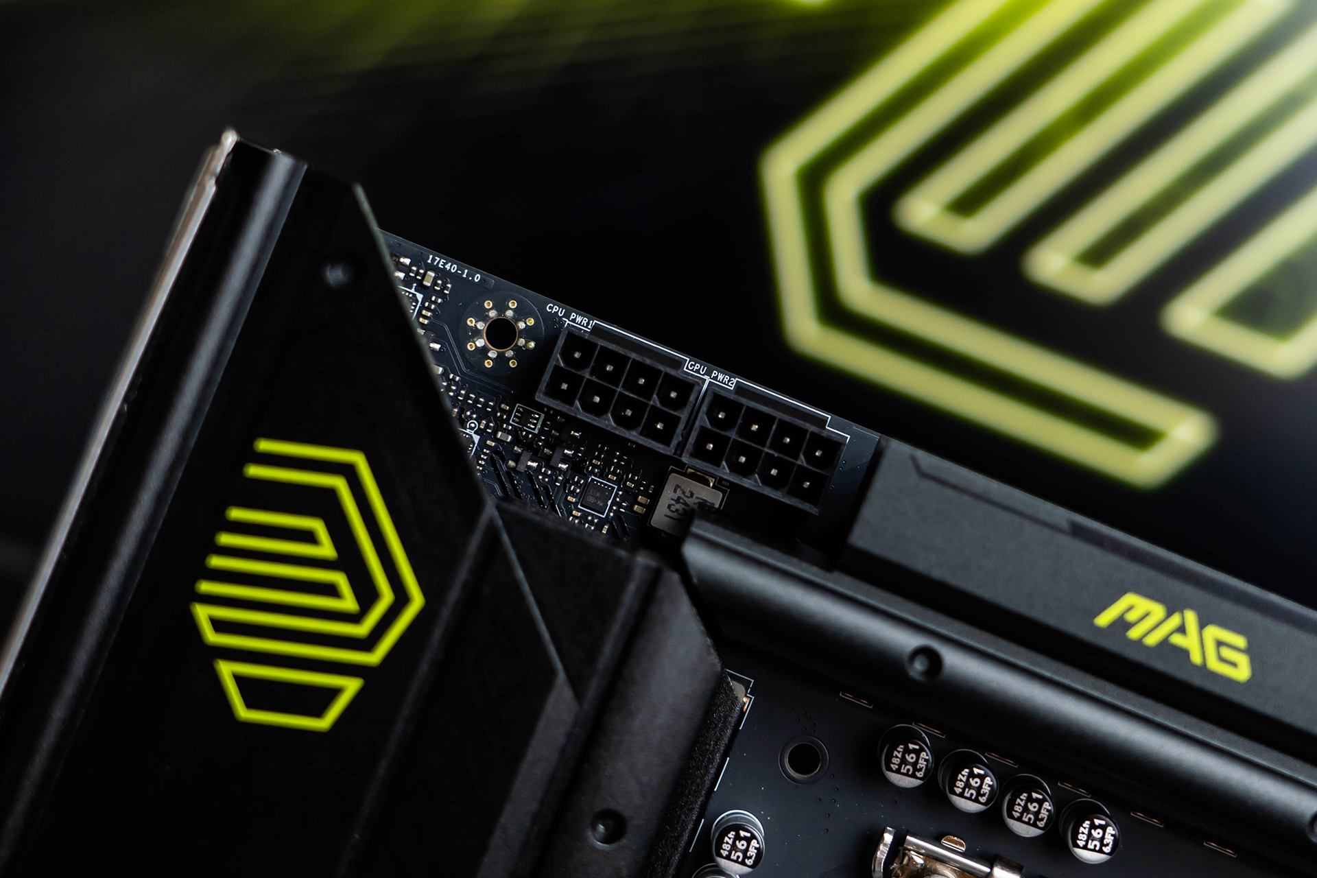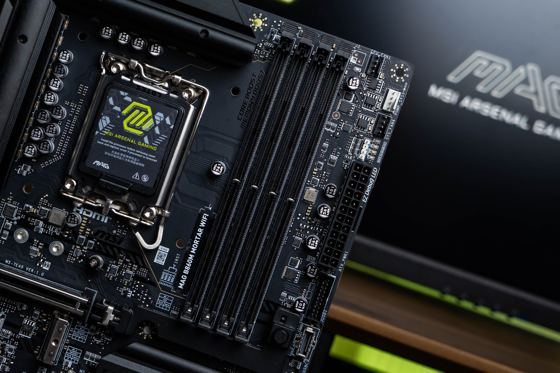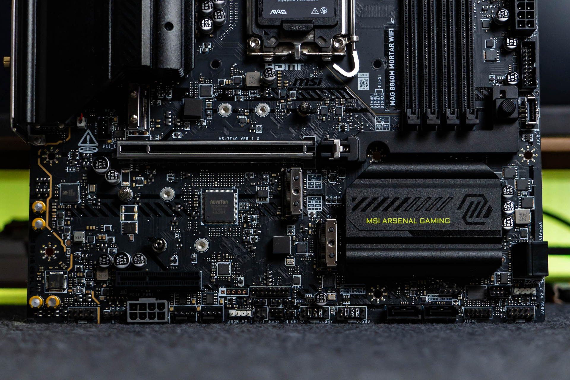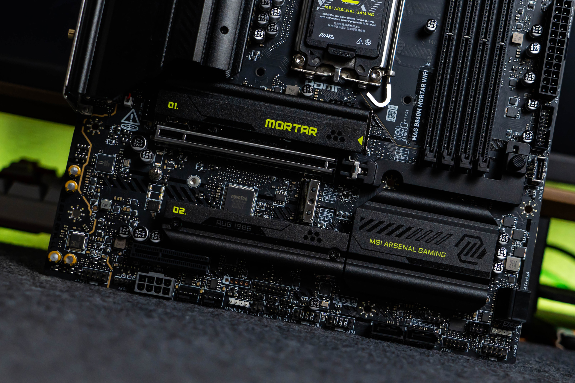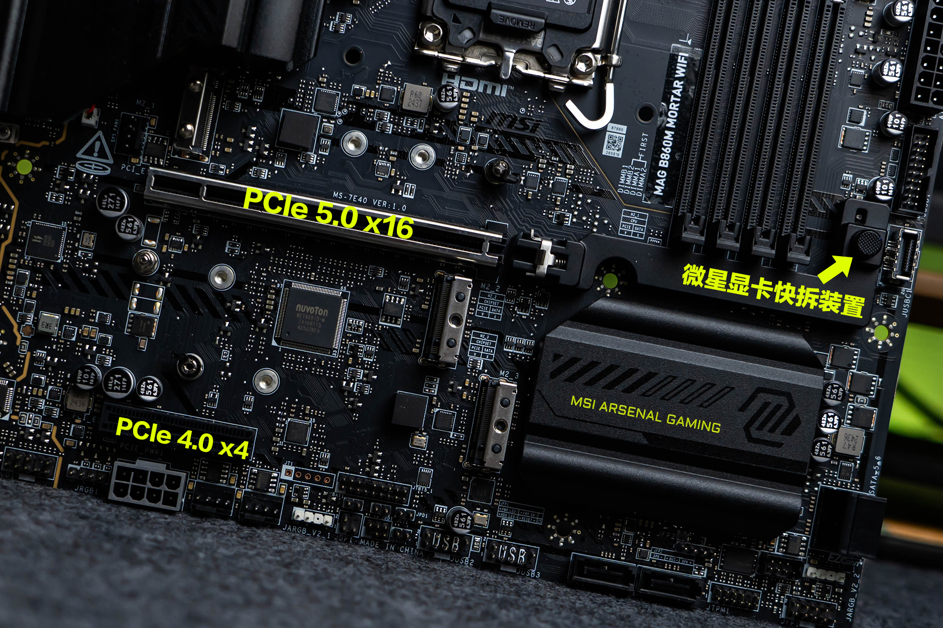 M.2插槽配备支持微星第二代独家EZ M.2 CLIP快拆设计的散热装甲,可轻松单手拆装,非常方便。装甲表面点缀了绿色的“MORTAR”字样和黑色暗纹元素,与上方VRM和下方芯片组散热片表面的装饰元素遥相呼应。