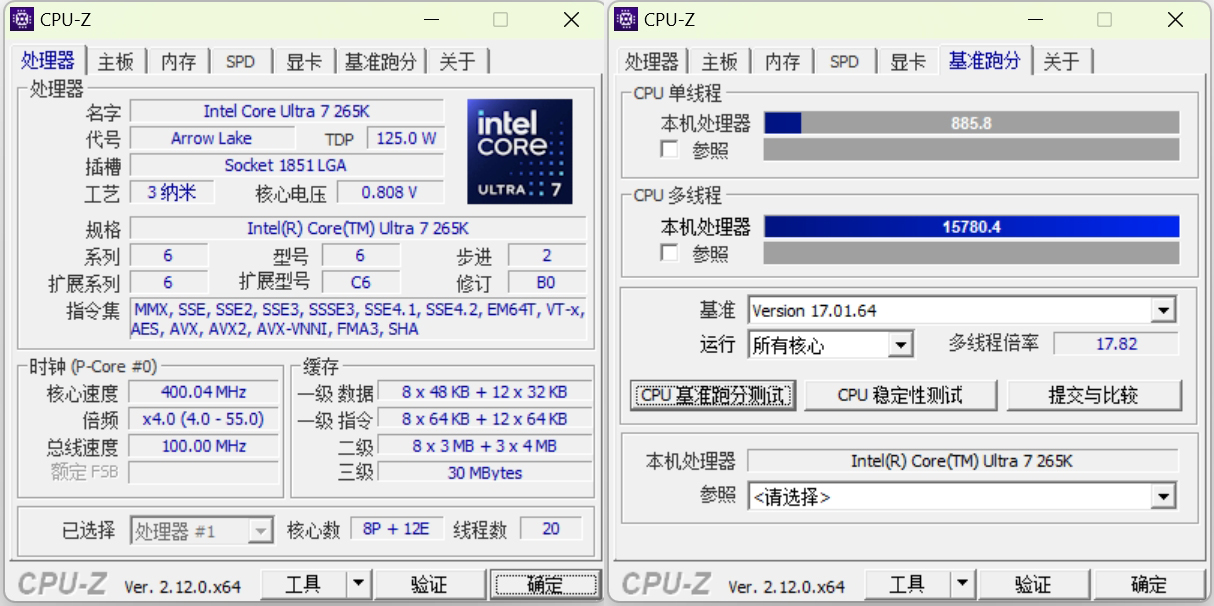 CPU-Z单线程测试得分885.8分,多线程测试15780.4分。