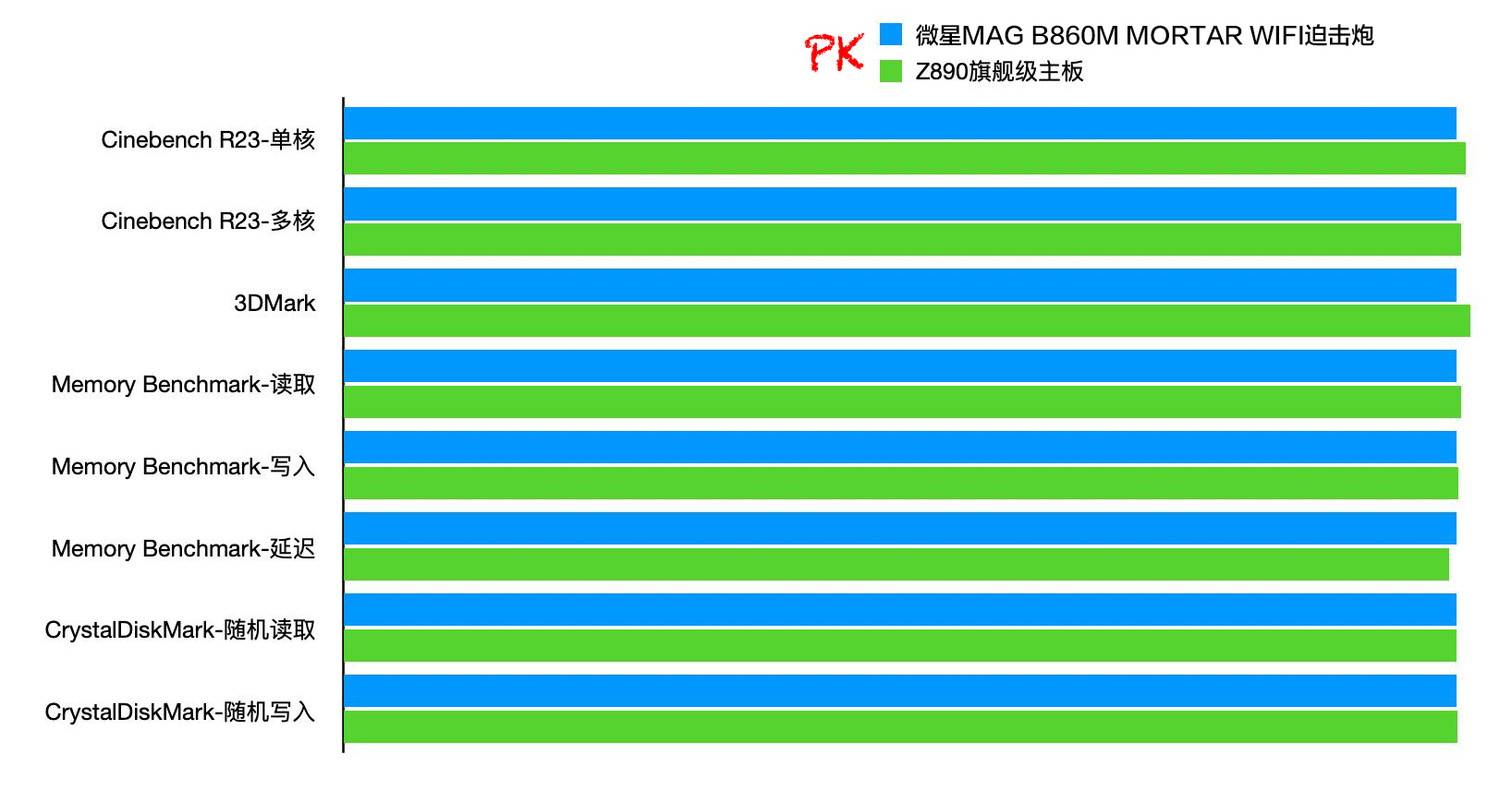 最后有一个比较有意思的问题:与Z890主板相比,B860主板会影响硬件性能的发挥吗?我特意用一张旗舰级Z890主板对同一套配置进行了性能测试,CPU、显卡、内存、SSD四大件在默认设置下的测试结果均与微星MAG B860M MORTAR WIFI迫击炮相差甚微(如下图),只有在挑战极限、压榨硬件性能的场景中,才能体现出Z890主板的优势。