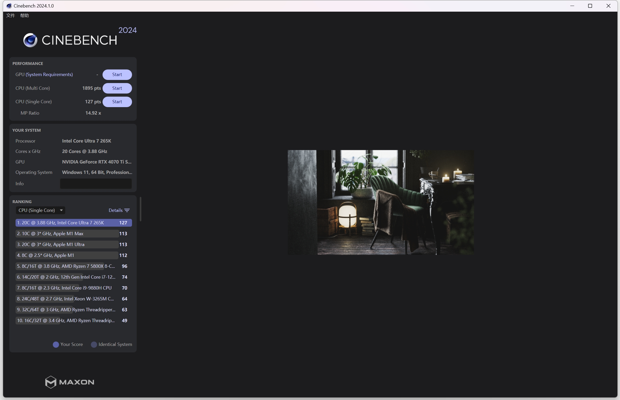 Cinebench 2024多核测试结果1895 pts,单核测试结果127 pts,MP Ratio 14.92x。(R23和2024是不同的测试场景,结果与R23没有可比性)
