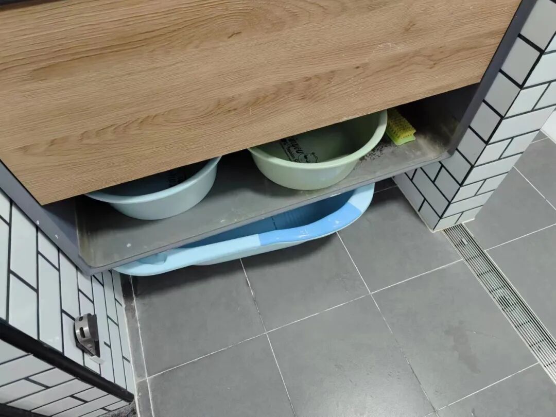 ①洗手盆下方:装修时下水管留在角落,洗手盆采取吊装方式,下方留空是收纳塑料盆的绝佳位置了,平时不用的塑料盆,可以塞进留空层里!采取双层留空的设计,还能让收纳翻倍,藏下两个塑料盆。