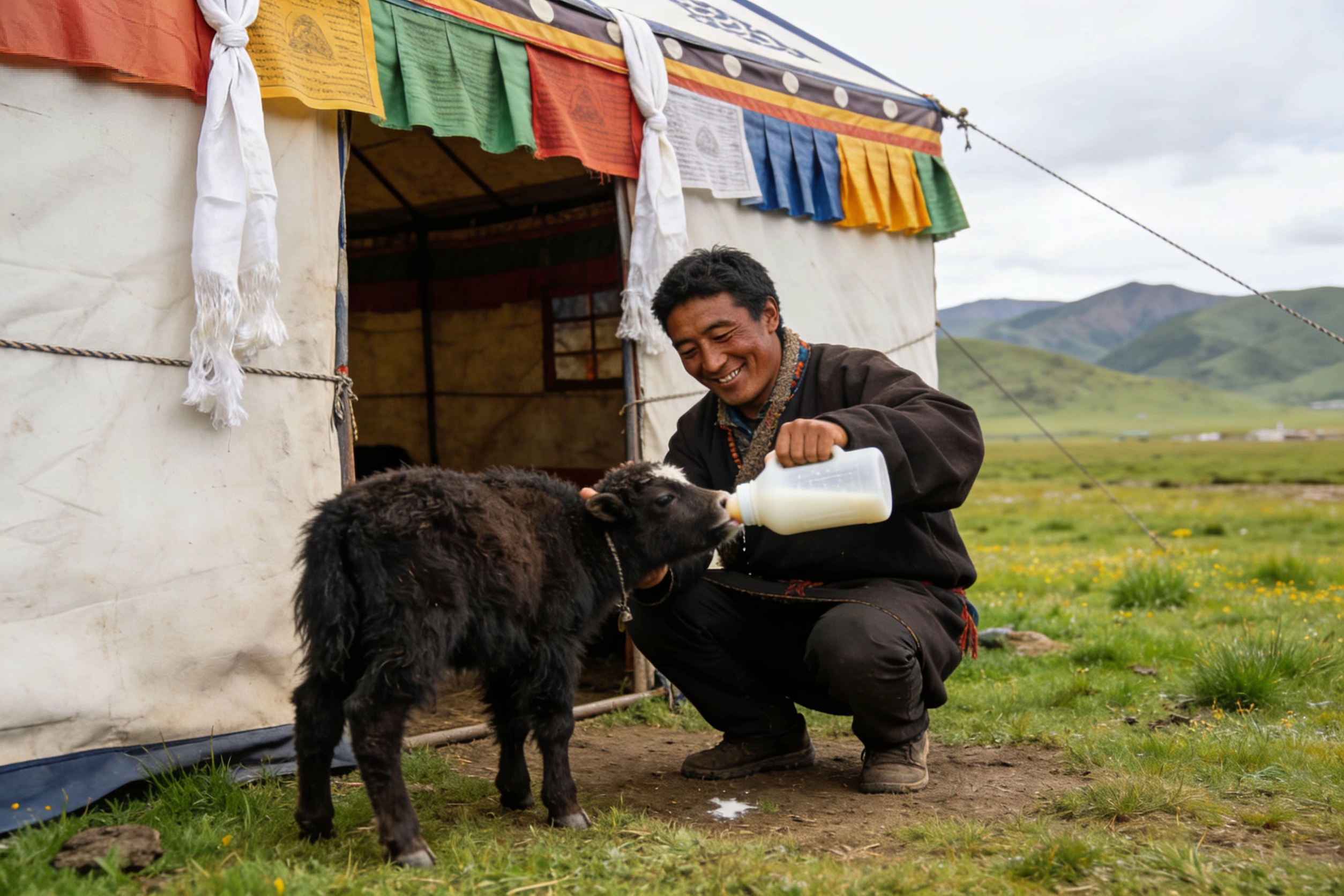 看到我们到来,他立刻放下奶桶,在藏袍上擦了擦手,大步迎上来。