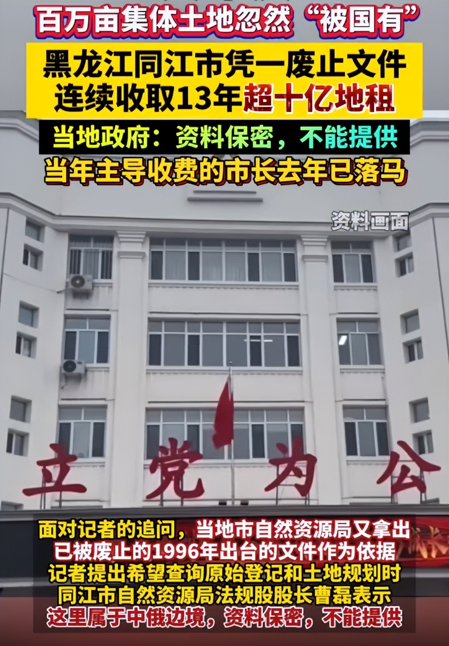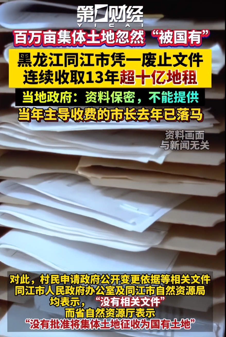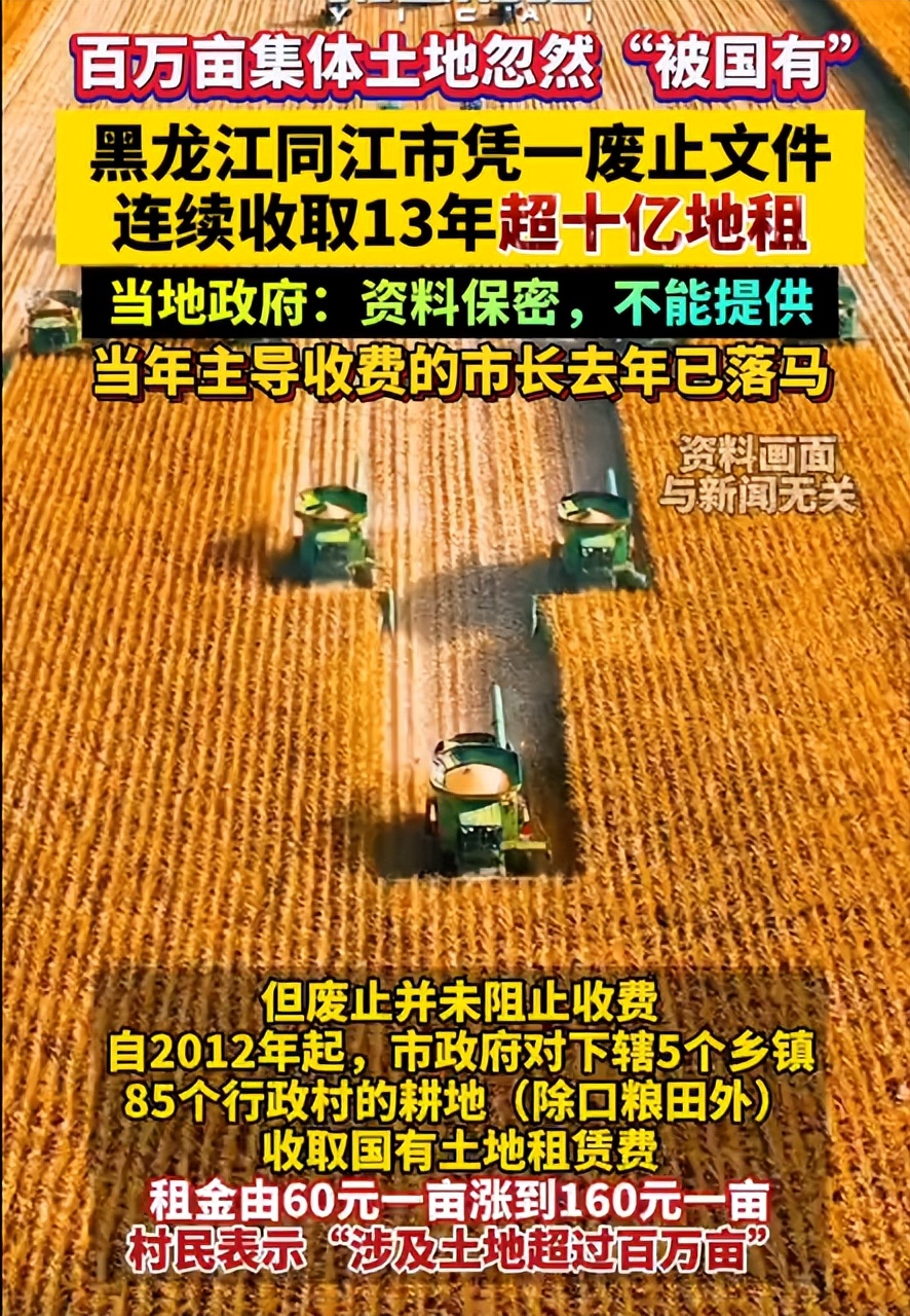 黑龙江同江市85个行政村的村民们,明明手握合法的集体土地承包证,当地政府却凭着一份早已废止的文件,将辖区内百万亩集体土地变相划为国有,在2012至2025年间违规收取地租累计超10亿元,这起荒唐的违规收费事件,不仅狠狠损害了万千农民的切身利益,更捅破了基层治理与土地监管领域的诸多漏洞,背后的猫腻与隐情令人发指。