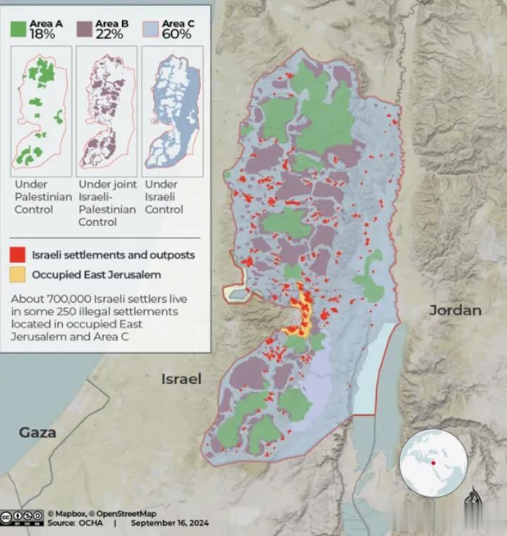 2月15日以色列内阁这次举动,是自1967年以来,该地区被以色列当成自家土地进行第一次系统性登记。按照1993年巴以签署的《奥斯陆协议》,约旦河西岸被划分为A、B、C三个区域。A区为巴勒斯坦控制,B区为巴勒斯坦和以色列共同管理,C区为以色列控制。按照协议规定5年过渡期过后,以色列控制权将移交给巴勒斯坦控制,C区面积占约旦河西岸60%的土地,住着几十万巴勒斯坦人。