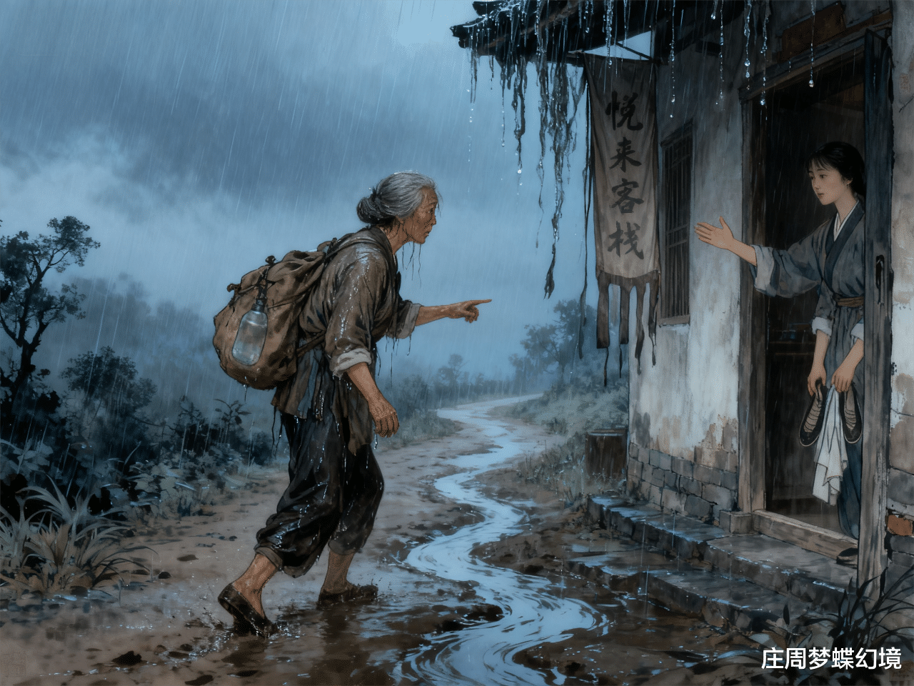 没想到半路遇上大雨,衣服鞋子全湿透了。王成这辈子从没受过这种苦,累得浑身发软,就暂时在客栈歇脚。雨却下个不停,从傍晚一直下到深夜,屋檐下的雨水像绳子一样往下淌。到了第二天,路上的烂泥更深了,看见过往行人陷在泥里没到脚踝,王成心里越发犯怵。