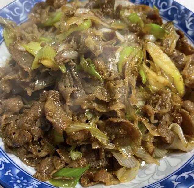 3. 锅中留少许底油,放入姜丝、蒜末爆香,加入大葱段翻炒至断生。倒入炒过的羊肉片,快速翻炒均匀,加生抽,食盐,鸡精,炒至入味,即可出锅。