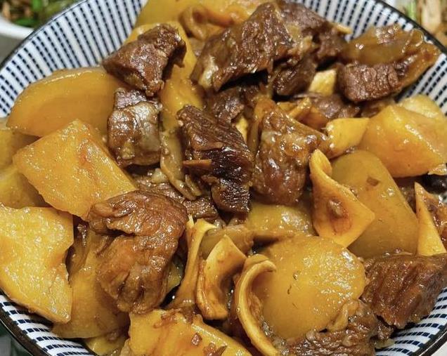 4. 倒入适量清水,没过牛腩,大火烧开后转小火炖煮 1小时。放入白萝卜块,继续炖煮 30 分钟左右,至萝卜熟透,牛腩软烂,加鸡精调味即可。