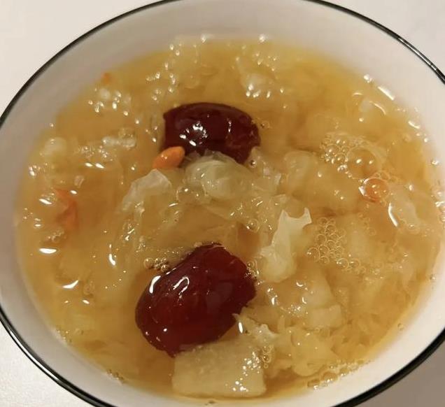3. 放入红枣,继续炖煮 20 分钟左右,至银耳软糯、红枣熟透。加入冰糖和枸杞,搅拌均匀,煮至冰糖融化即可。