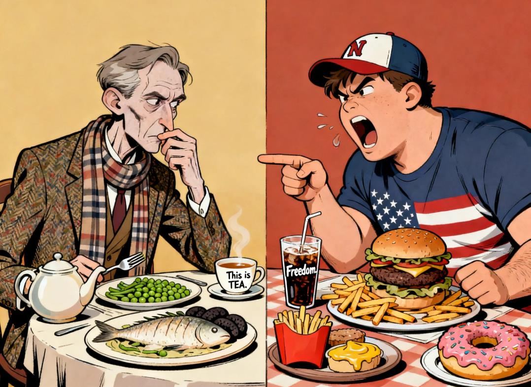 处于欧洲末位的英国与被整个欧洲鄙视的美国,这两者之间的美食战争也是旷日持久,可以概括为八个字:菜鸡互啄,越啄越嗨。