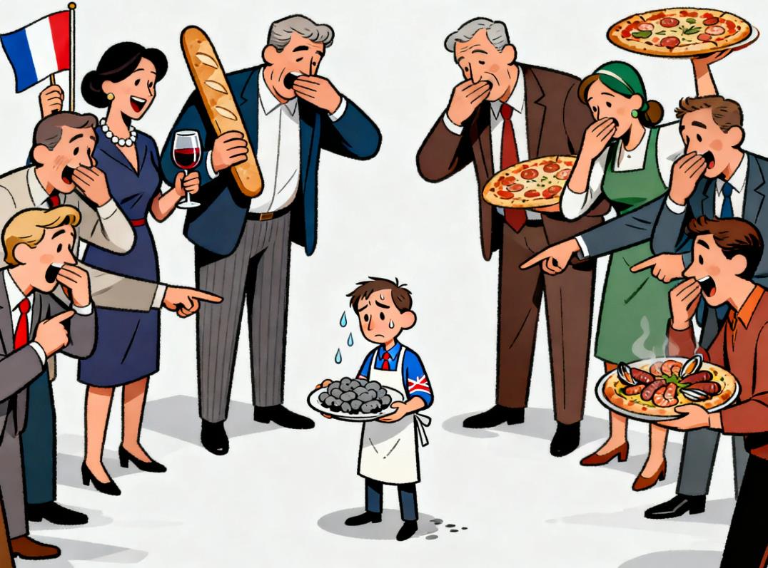 而在欧洲内部,美食鄙视链的核心逻辑也非常简单:法国人看不起所有人,意大利人看不惯任何人糟蹋他们的菜,德国人被所有人看不起,而英国人被所有人看“不见”。